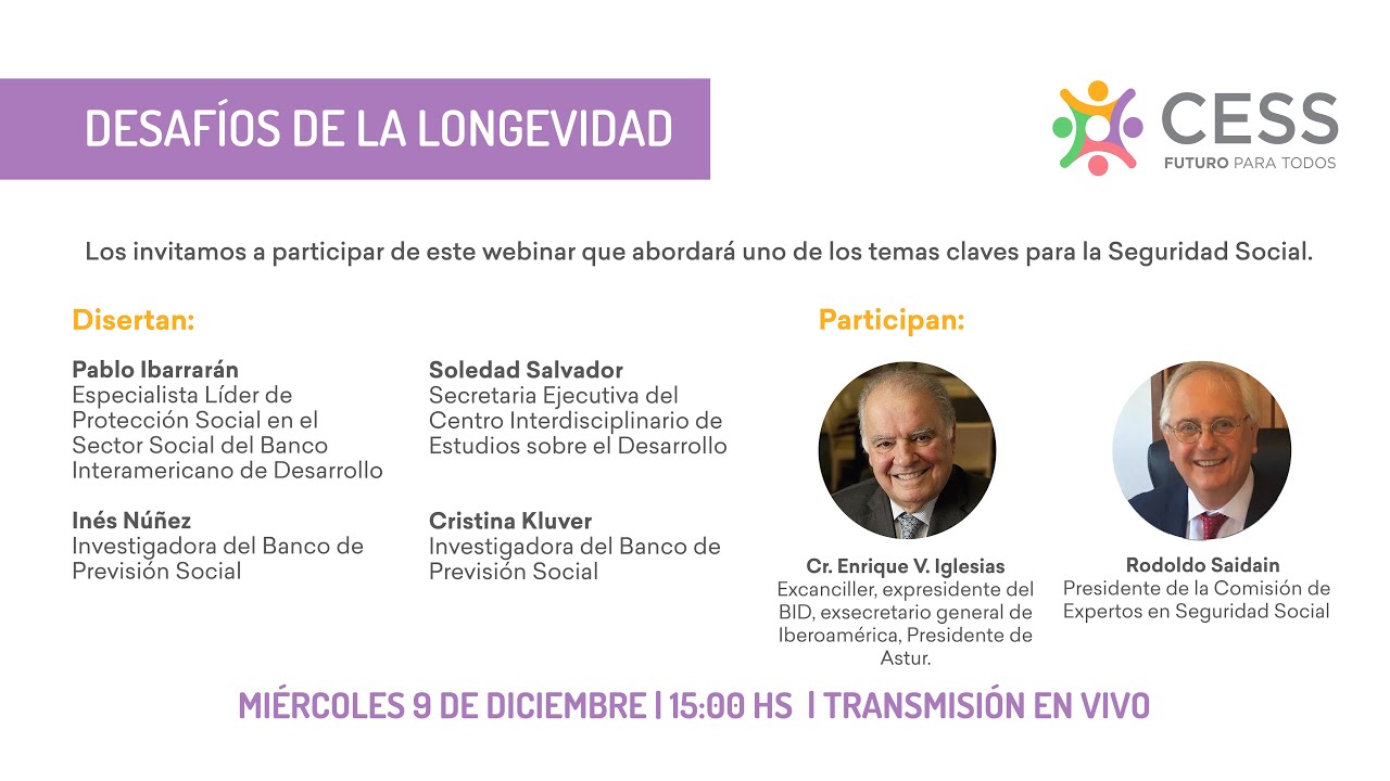 En este webinar, contó con la participación del Contador Enrique V. Iglesias, disertaron el Especialista Líder de Protección Social en el Sector Social del Banco Interamericano de Desarrollo, Pablo Ibarrarán, que expuso sobre «Retos y oportunidades de los servicios de apoyo a la dependencia»; la Secretaria Ejecutiva del Centro Interdisciplinario de Estudios sobre el Desarrollo, Soledad Salvador, que habló de «La mirada de género en el sistema previsional uruguayo»; y las investigadoras del Banco de Previsión Social Inés Núñez y Cristina Kluver, que disertaron sobre «Características de los hogares de las personas mayores». El presidente de la CESS, Rodolfo Saldain, formó parte de la actividad.