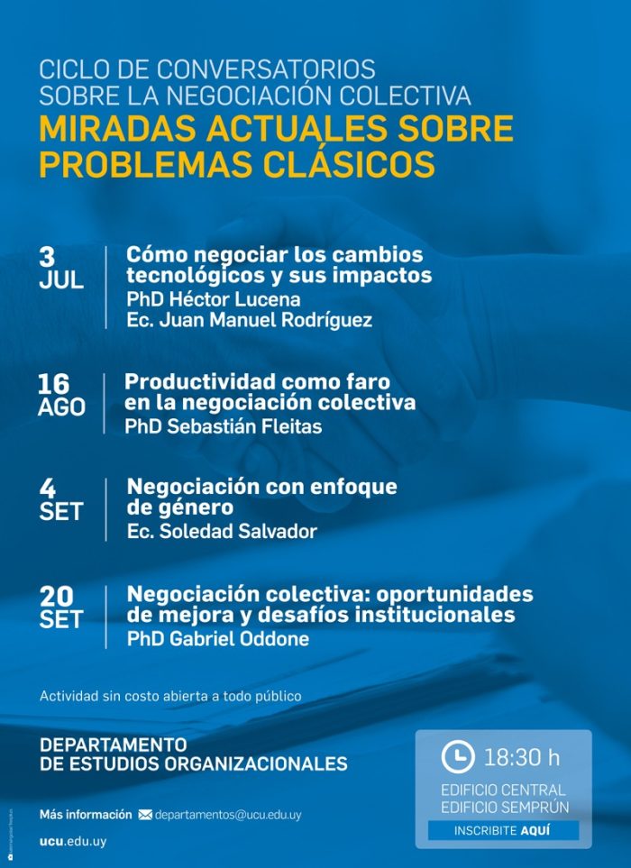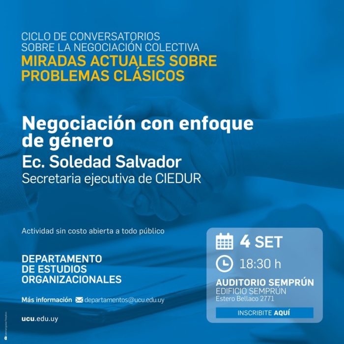 En el marco del Ciclo de Conversatorios sobre Negociación Colectiva «Miradas actuales a problemas clásicos» organizados por el Departamento de Estudios Organizacionales de la Universidad Católica del Uruguay (UCU), Soledad Salvador presentará junto a Laura Triaca y María José Gonzáles de la Unidad Estadística de Trabajo y Seguridad Social del Ministerio de Trabajo y Seguridad Social (MTSS).