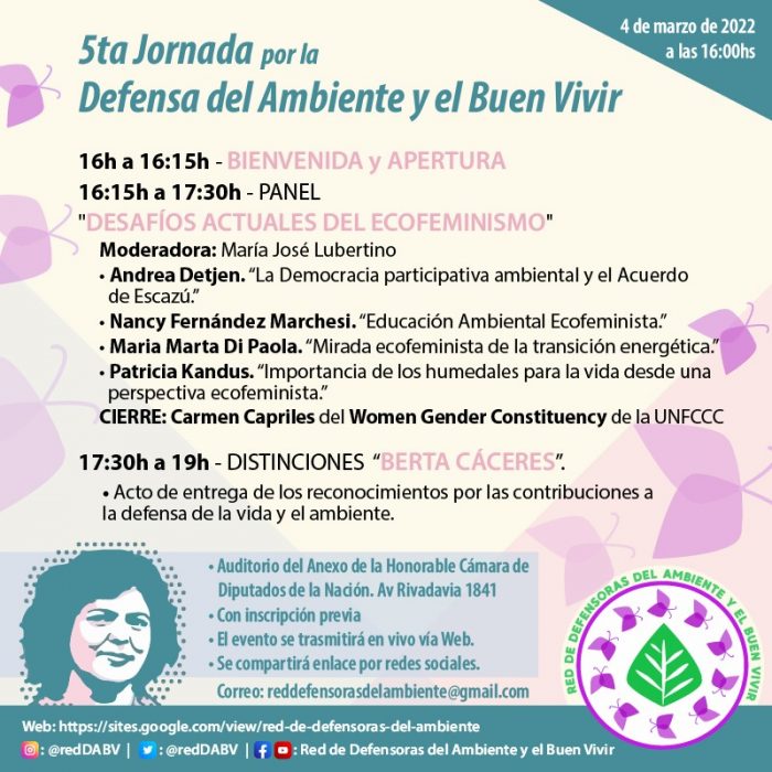 Se desarrollará el panel «DESAFÍOS ACTUALES DEL ECOFEMINISMO EN ARGENTINA» y la entrega de distinciones “BERTA CÁCERES”.
