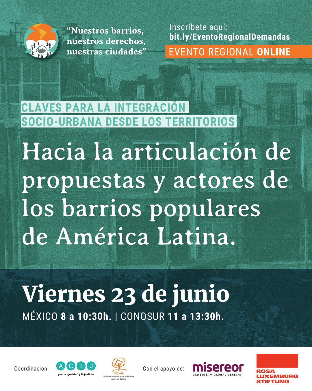 El 23 de junio llevaremos a cabo el evento: «Claves para la integración socio-urbana desde los territorios: Hacia la articulación de propuestas y actores de los barrios populares de América Latina», en donde presentaremos nuestras propuestas a representantes de gobiernos y agencias financiadoras, así como con aliadxs, integrantes de organismos de la sociedad civil y redes regionales e internacionales.