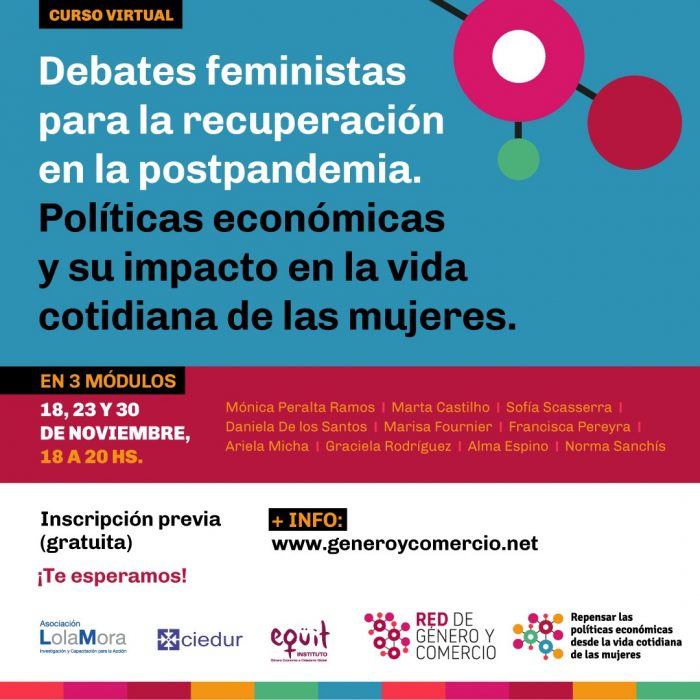 Junto a la Red de Género y Comercio, la Asociación Lola Mora, el Instituto Equit – Gênero, Economia, Cidadania Global, organizamos el curso virtual «Debates feministas para la recuperación en la postpandemia. Políticas económicas y su impacto en la vida cotidiana de las mujeres».