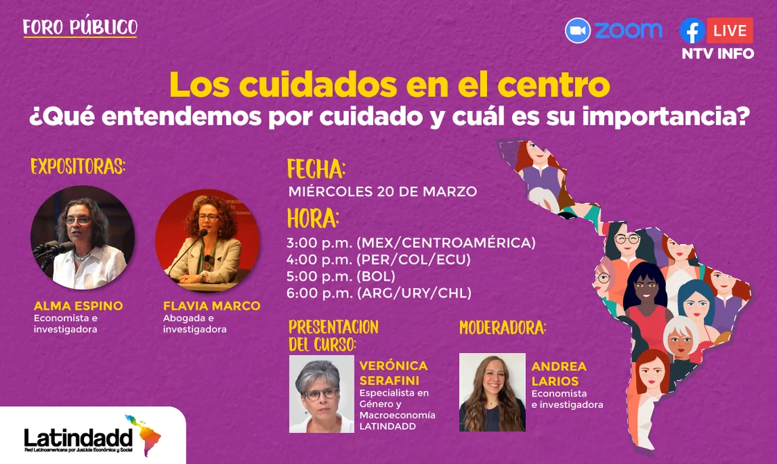 Este Foro I, desarrollado en marco de la apertura de los cursos sobre Economía Feminista (Básico y Tópicos Especializados) de Latindadd, contará con la participación de dos expertas latinoamericanas en género y cuidados. Alma Espino (Uruguay) expondrá sobre la importancia del financiamiento de los cuidados por parte de los Estados de cara a construir sociedades con mayor igualdad social y de género. Por otro lado, Flavia Marco (Bolivia), pondrá en debate las agendas y demandas de cuidado que emergen desde la sociedad.