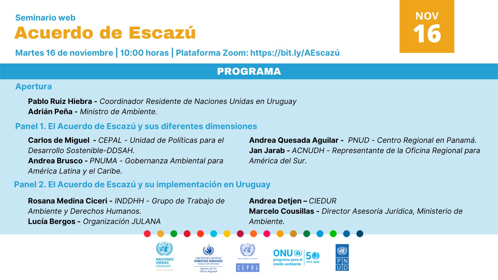 Las Naciones Unidas en Uruguay, a través de ACNUDH, CEPAL, PNUMA y PNUD, organizan el seminario web sobre el Acuerdo de Escazú, un compromiso regional sobre el acceso a la información, la participación pública y el acceso a la Justicia en asuntos ambientales en América Latina y el Caribe. La actividad contará con la participación de especialistas nacionales e internacionales.